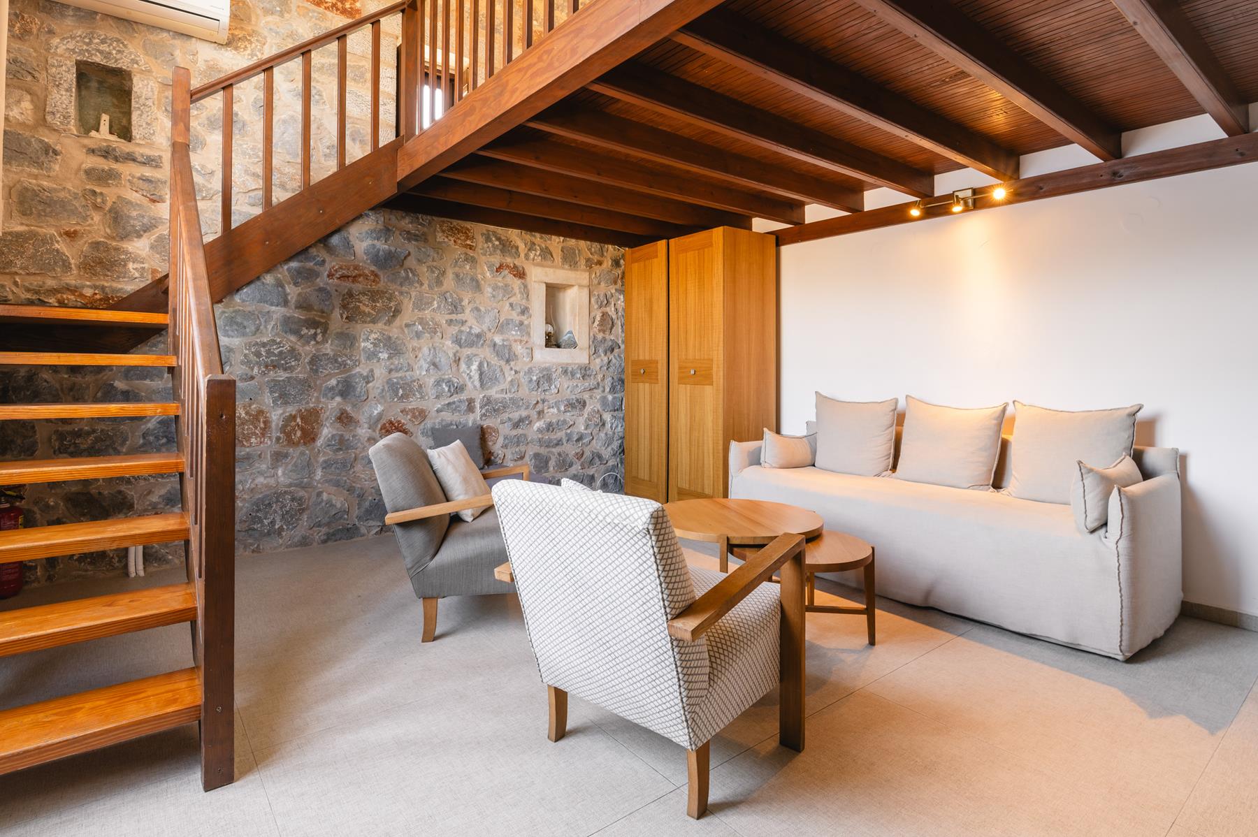 Very spacious, air-conditioned room is 40 sq.m.,featuring traditional décor with stone or marble floors and private balcony. Includes a kitchenette with fridge, 1 double bed,1 sofa bed, hairdryer and Olivia by Papoutsanis toiletries.